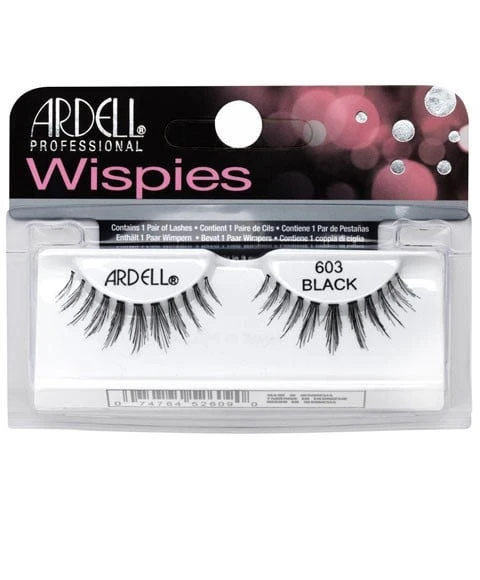 Ardell Wispies Lashes 603 , These lashes are a slightly more natural version of the 600 Wispies Cluster lashes. Their plush cluster style, which is longer in the center and shorter at the corners, has a bright, eye-opening effect. They are knotted and feathered for perfect uniformity.