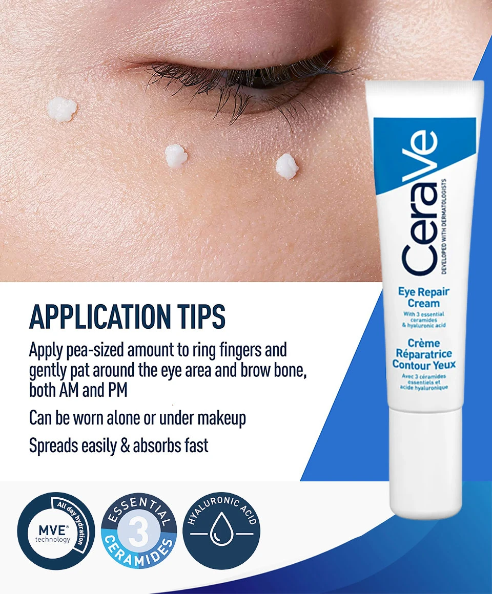 Hydrates and Nourishes: The rich, non-greasy formula of CeraVe Eye Repair Cream provides long-lasting hydration and nourishment to the delicate skin around the eyes, helping to improve skin texture and reduce the appearance of fine lines and wrinkles.