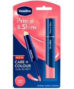 Prime And Shine 2 In 1 Lip Balm Warm Nude.Add a twist of color to your lip care routine with brand new Vaseline Prime & Shine. With this new 2-in-1 Lip Balm and Colored Gloss. The moisturising power of Vaseline Petroleum Jelly is now available in a dual stick, with a colored gloss, to give you the perfect pair of lips.